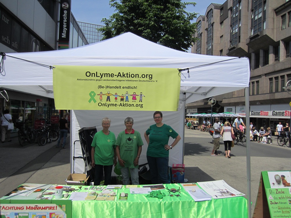Am 12. Mai in Dortmund waren wir gut besucht und sehr gefordert, immer wieder vorgebrachte Falschinformationen zu berichtigen. Es formt sich die Erkenntnis, dass es in Nordrhein-Westfalen sehr hohen Aufklärungsbedarf gibt. Sehr beliebt waren Aussagen wie: "In Dortmund gibt's doch keine Zecken", "Die sind doch nur in Bayern", "Kommen die auch in den Garten?" und immer wieder "Zeckenimpfung" und die "Deutschland-Zecken-Karte" oder "Borreliose-Karte". Viele Besucher hatten schon eigene Erfahrungen gemacht und wollten Rat oder Bestätigung, es gab auch die unterschiedlichsten Erfahrungen mit Ärzten, auch ein paar gute