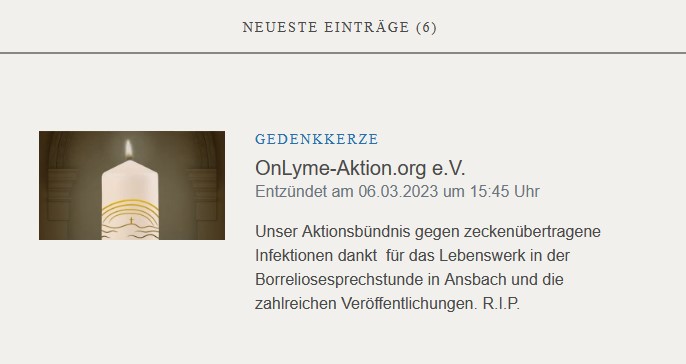 Dr. med Hatto Müller-Marienburg hat viele Jahre Patienten in der Borreliosesprechstunde in Ansbach begleitet. Danke für das Lebenswerk und die hinterlassenen Veröffentlichungen. R.I.P.