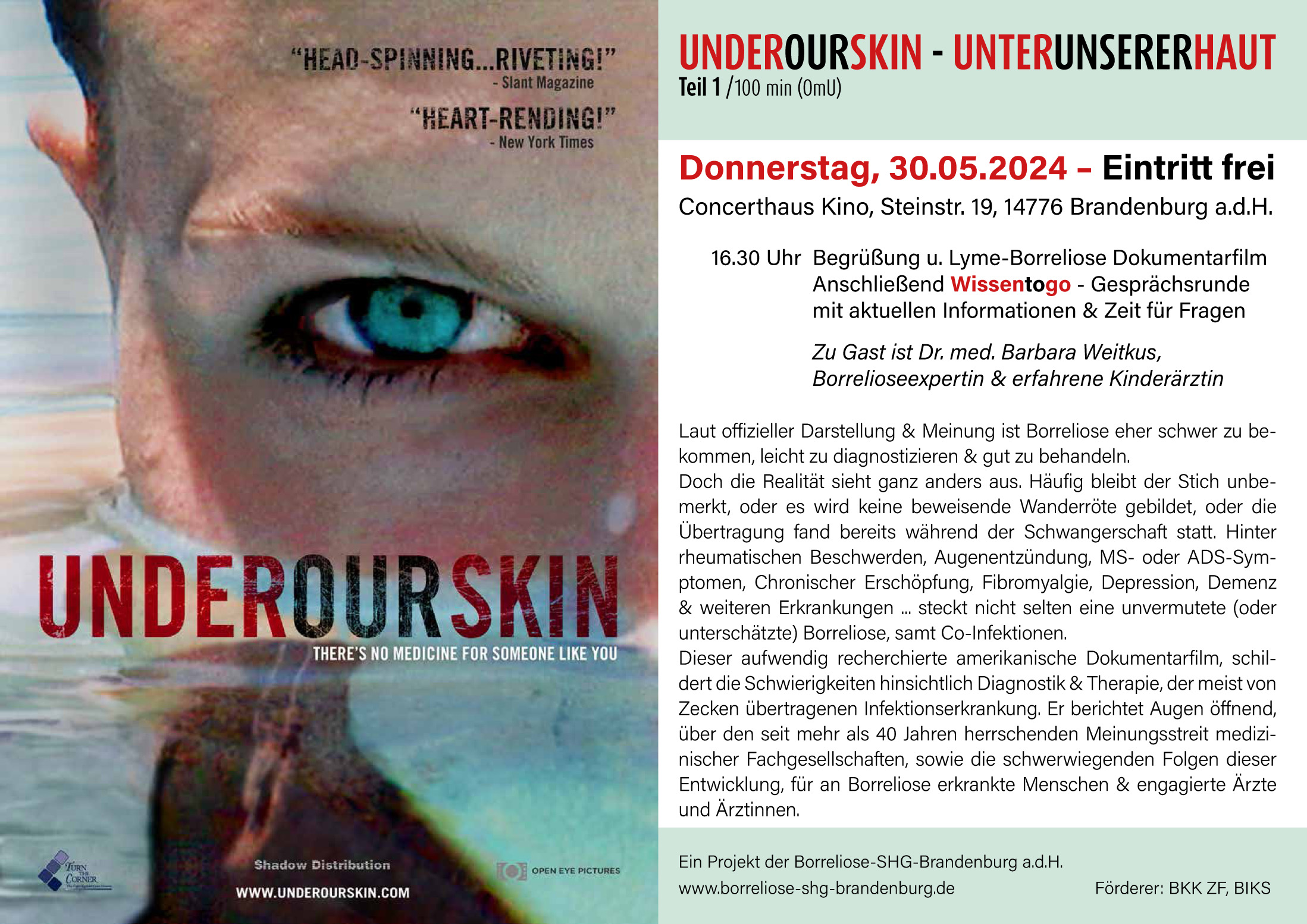 Sie zeigen am 30. Mai 2024 in Brandenburg ab 16.30 Uhr den Dokumentarfilm UNDER OUR SKIN mit anschließender WissenToGo-Gesprächsrunde. Zu Gast ist Dr. med. Barbara Weitkus. Alles weitere auf dem Plakat oder für Nichtforenmitglieder direkt auf der Homepage der SHG (Klick hier).