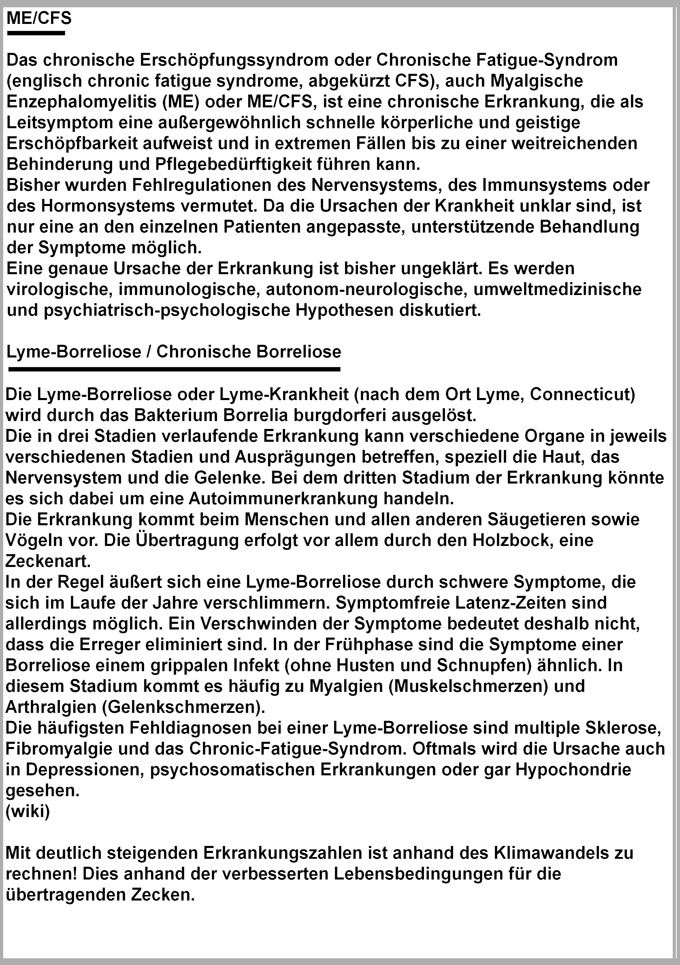 Das Problem ist die medizinische Kontroverse, die aufgrund der miesen Diagnostika entstanden ist. Ohne Diagnose keine Therapie. Das muss meiner Meinung in den Messages im Mittelpunkt stehen. Nicht irgendwelche Behauptungen, die du nicht belegen kannst, wenn Rückfragen kommen (sollte überhaupt jemand Notiz davon nehmen).
