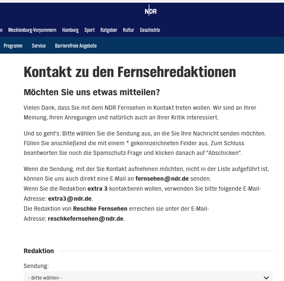 Die steht über dem Kontaktformular: fernsehen@ndr.de