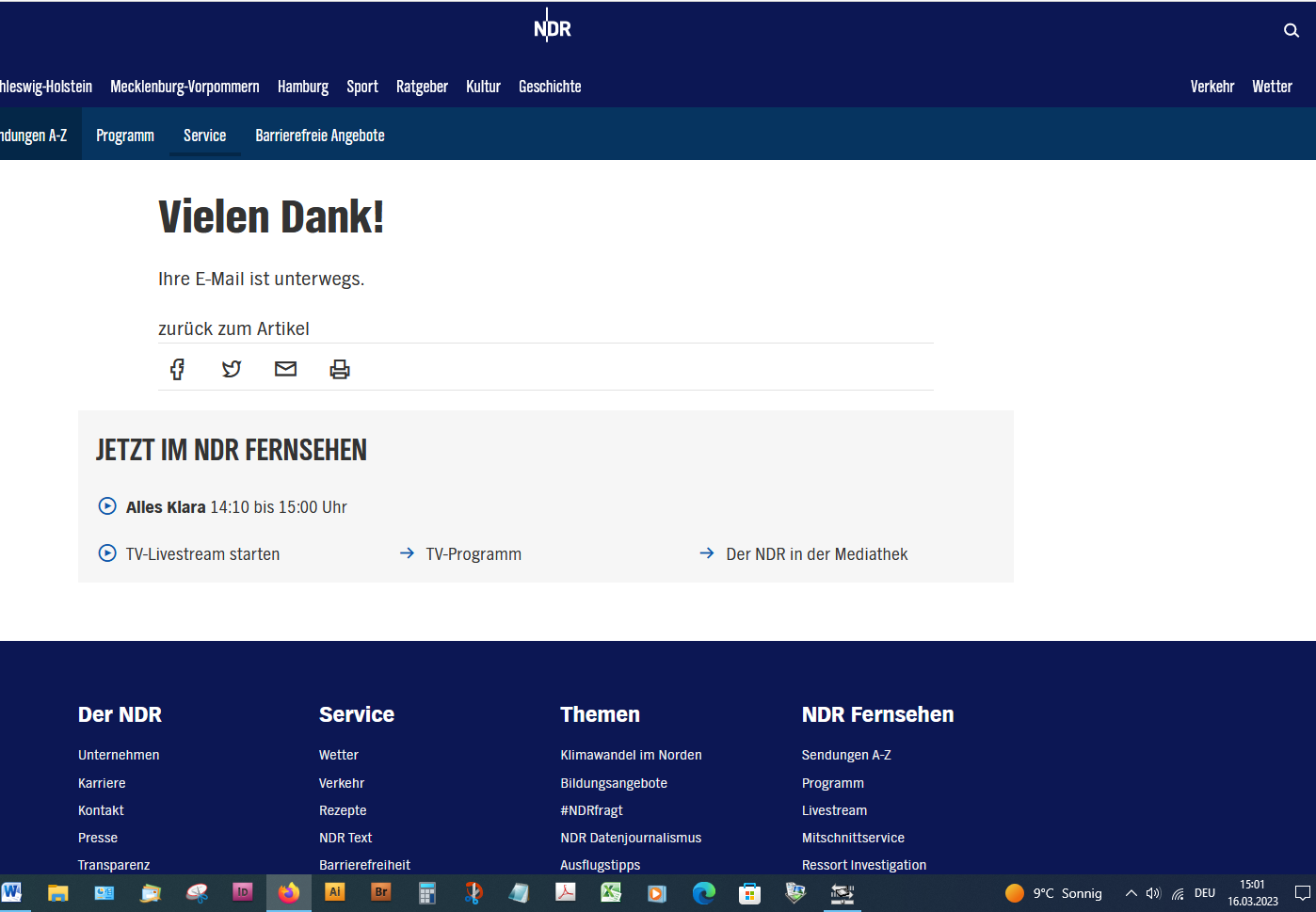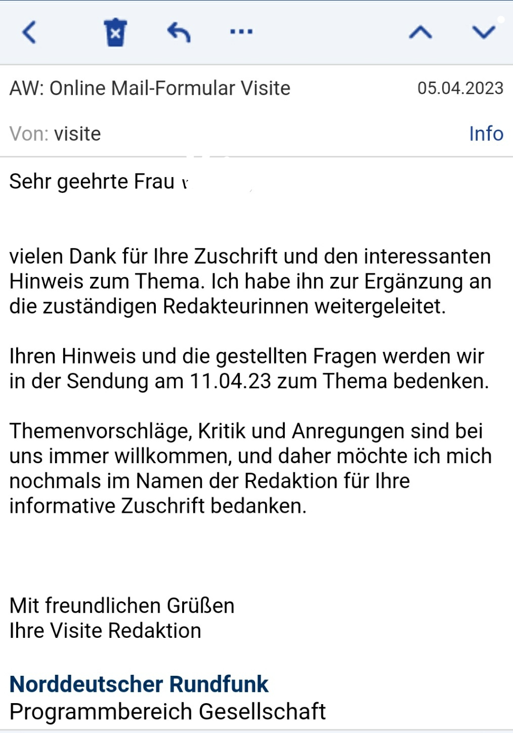 Also wenn, da im Laufe des Tages keine Bestätigung auf unserer Mail-Adresse erscheint, werde ich es nochmal direkt an den NDR senden.